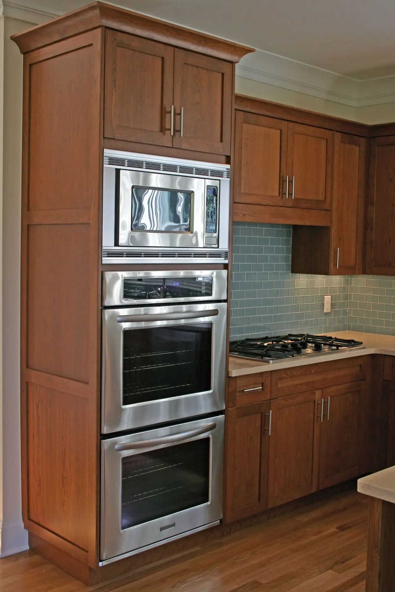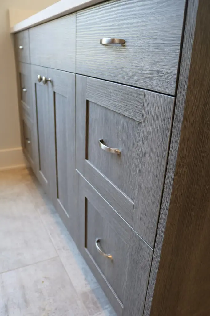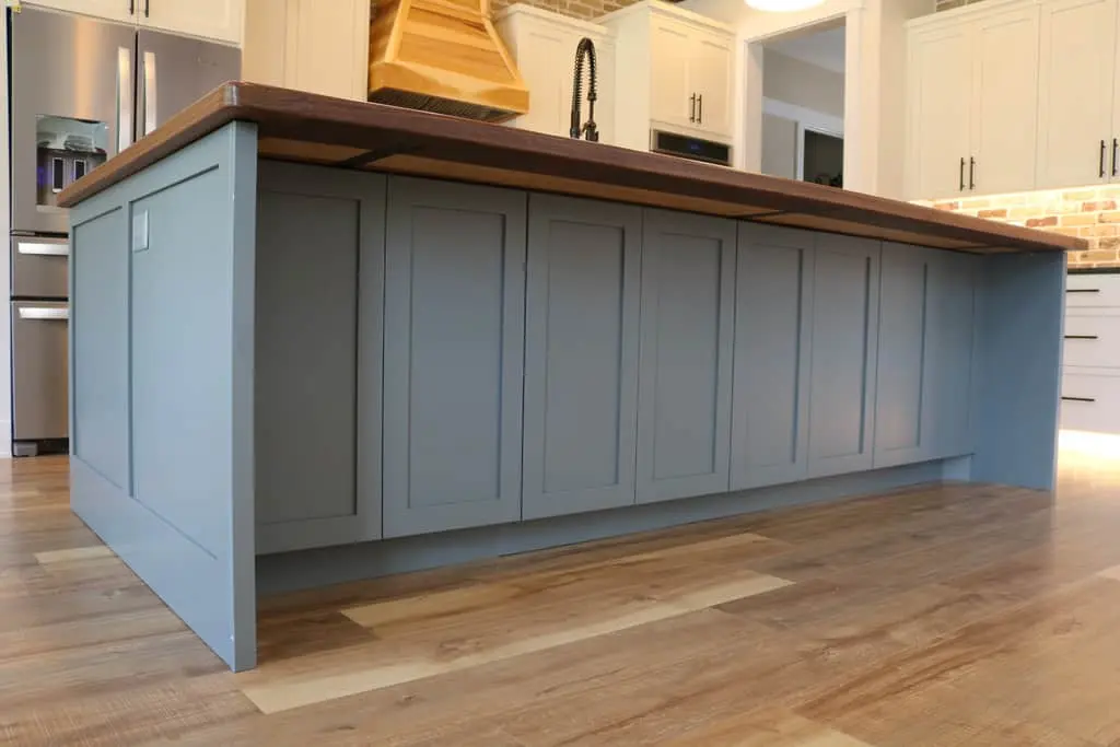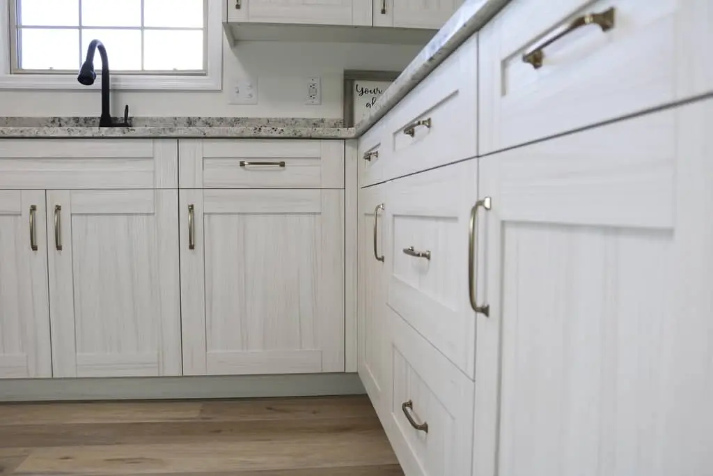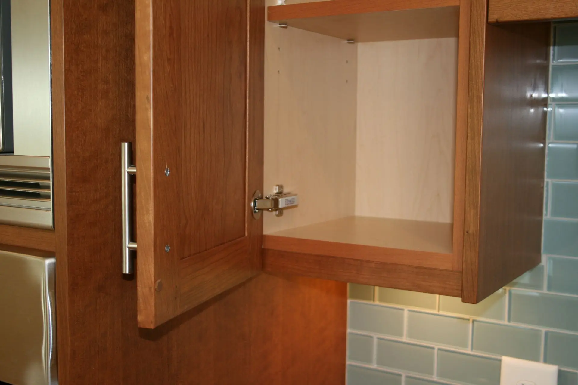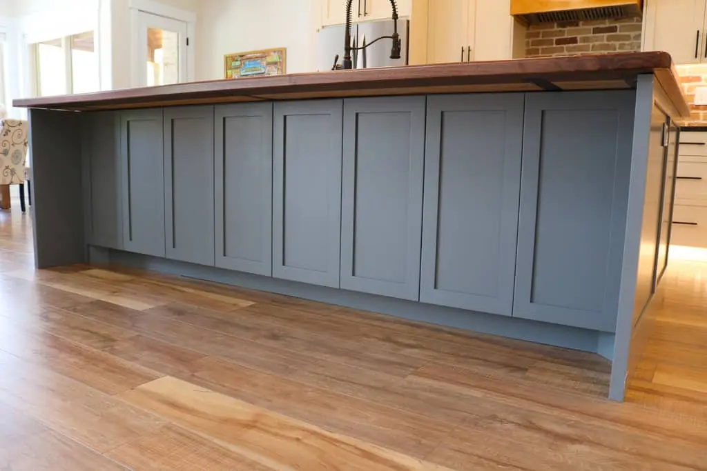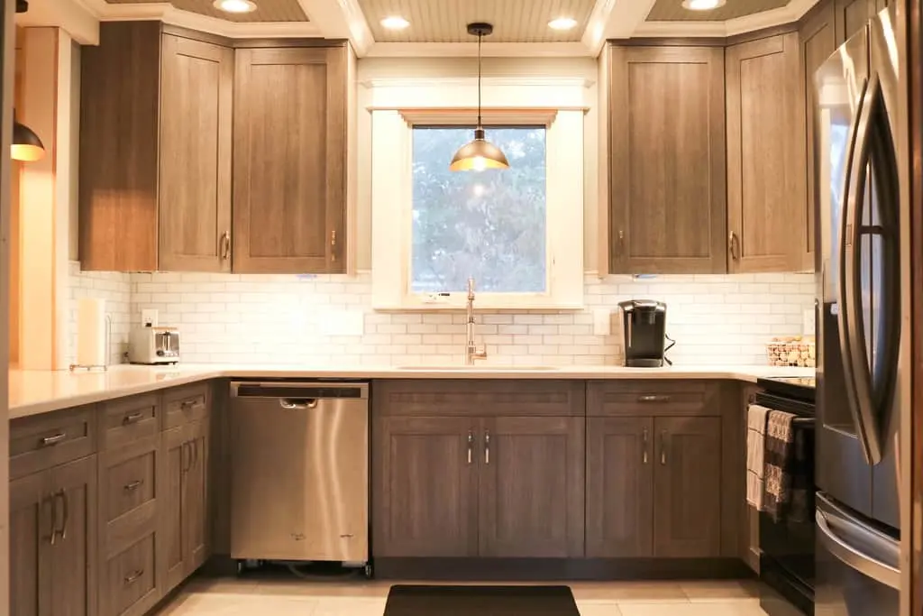 Shaker cabinets are made from a five-piece door, which comprises a four-piece frame with a flat panel in the center. These cabinets are traditionally made from high-quality American wood, but it's now fairly common to see them manufactured from MDF as five-piece or one-piece doors and painted in pretty much any color under the sun. For a more modern look, some homeowners will paint the upper cabinets one color, and then use a different paint or wood stain for the lower cabinets.