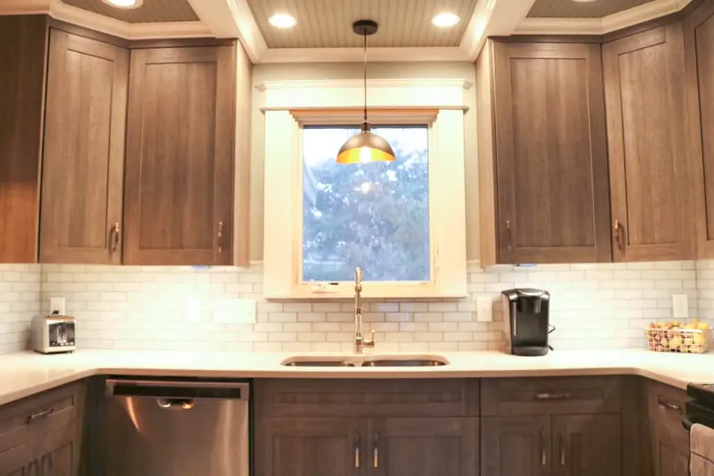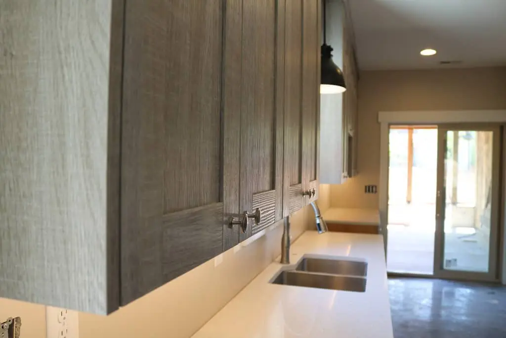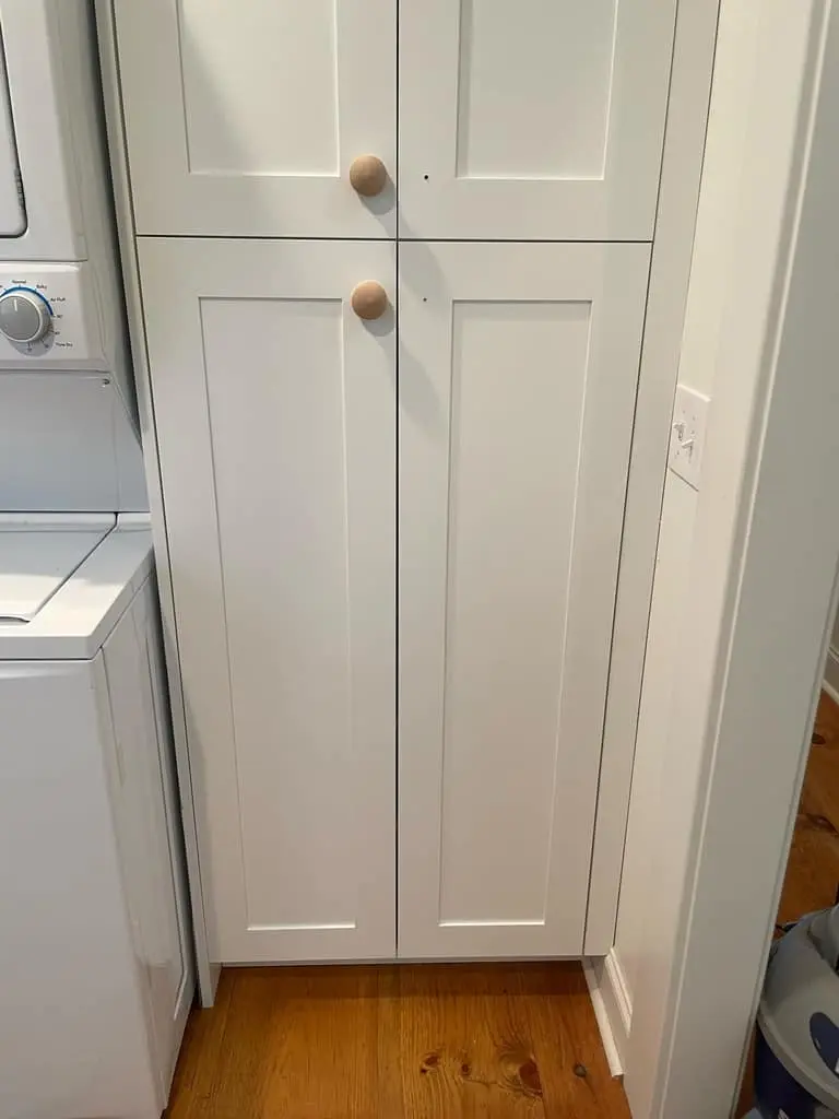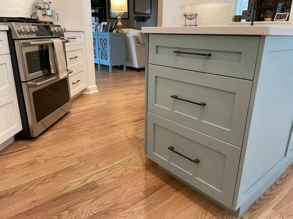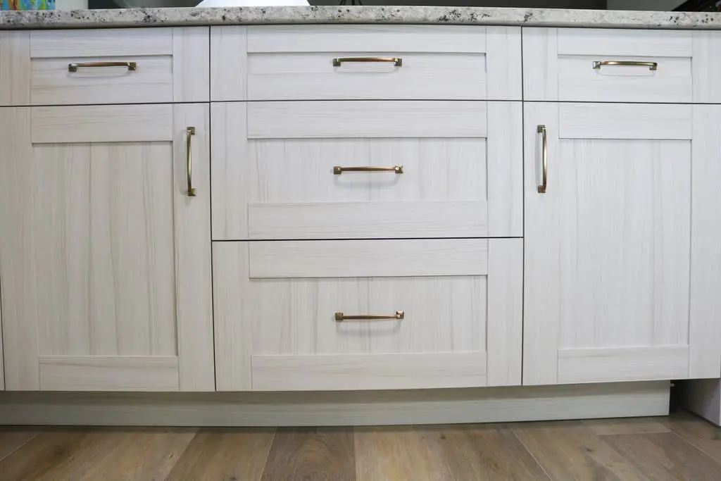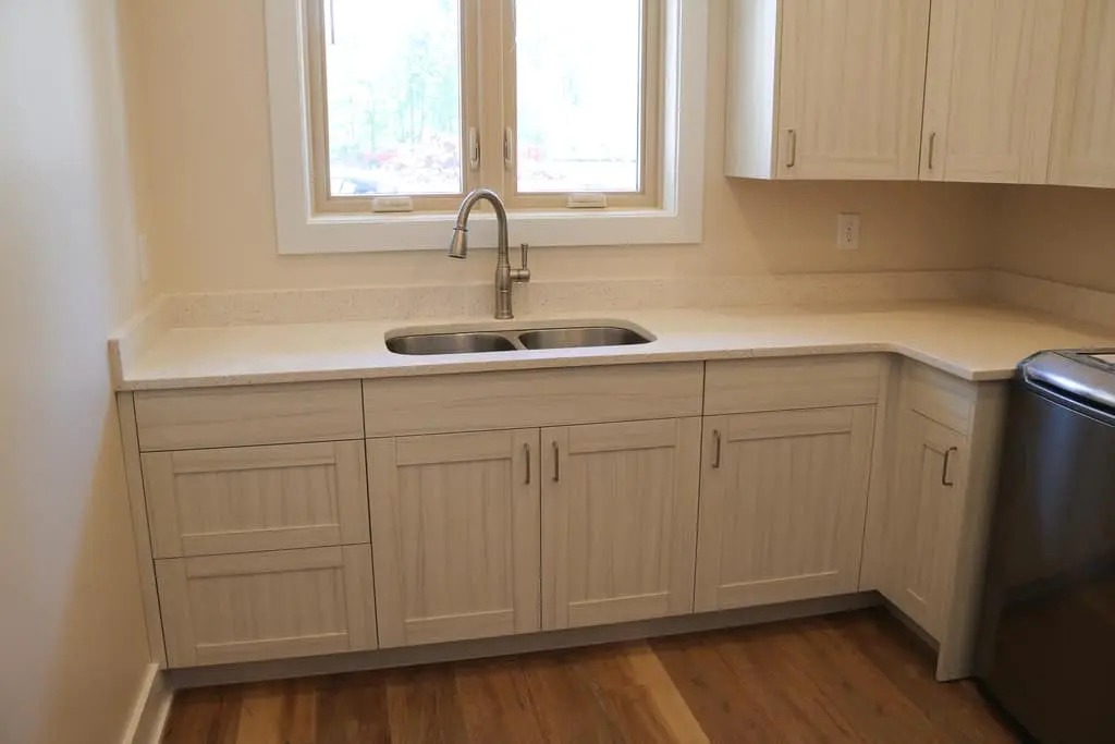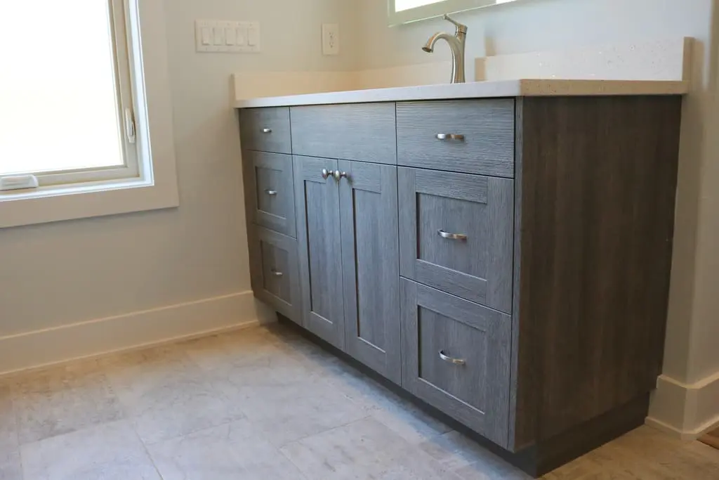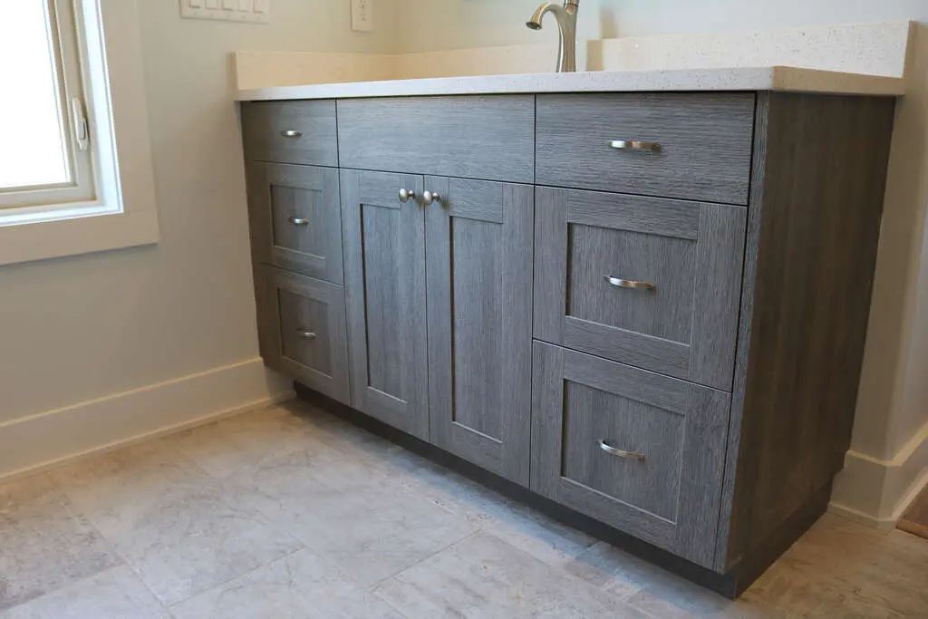 Shaker cabinets are made from a five-piece door, which comprises a four-piece frame with a flat panel in the center. These cabinets are traditionally made from high-quality American wood, but it's now fairly common to see them manufactured from MDF as five-piece or one-piece doors and painted in pretty much any color under the sun. For a more modern look, some homeowners will paint the upper cabinets one color, and then use a different paint or wood stain for the lower cabinets.