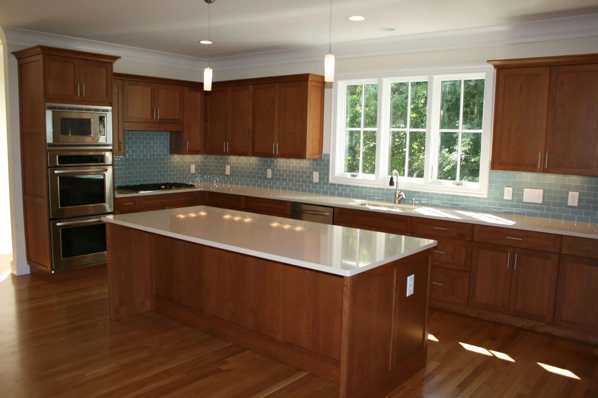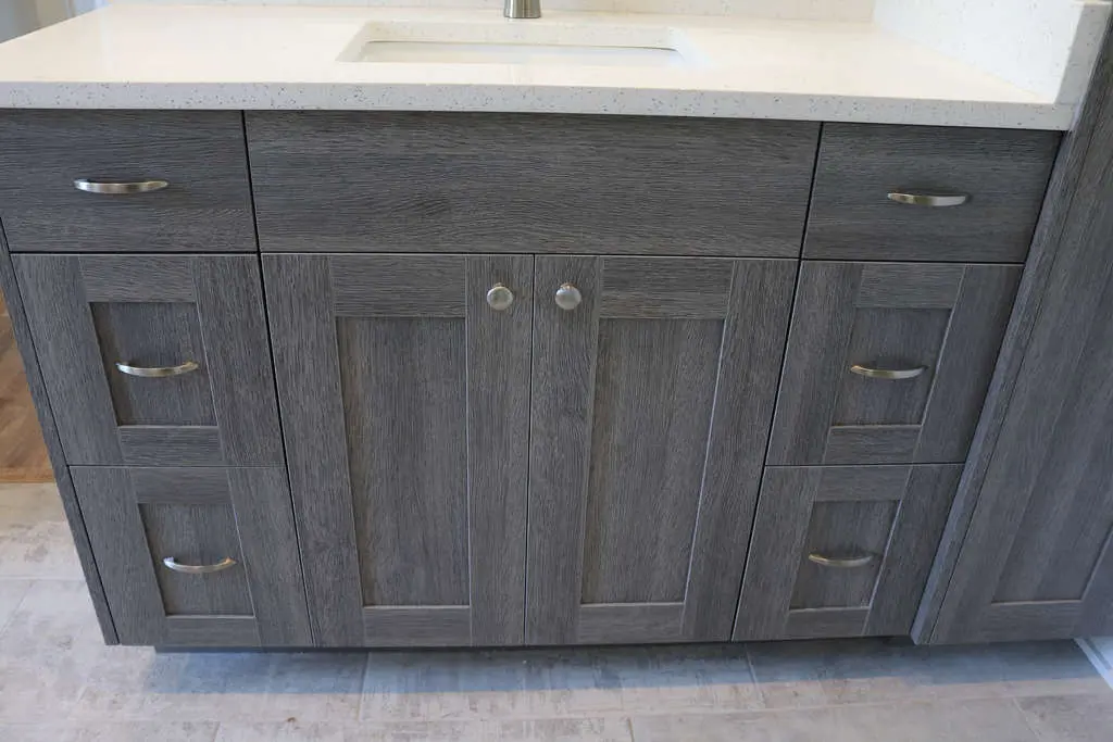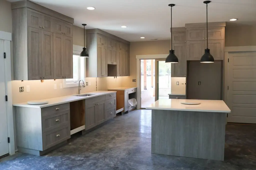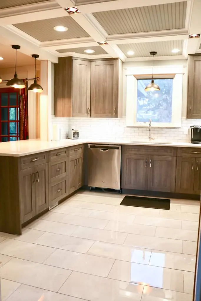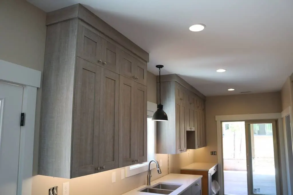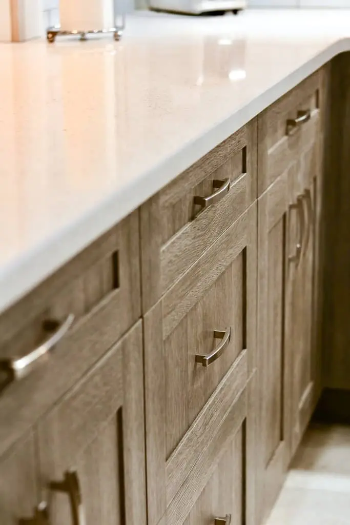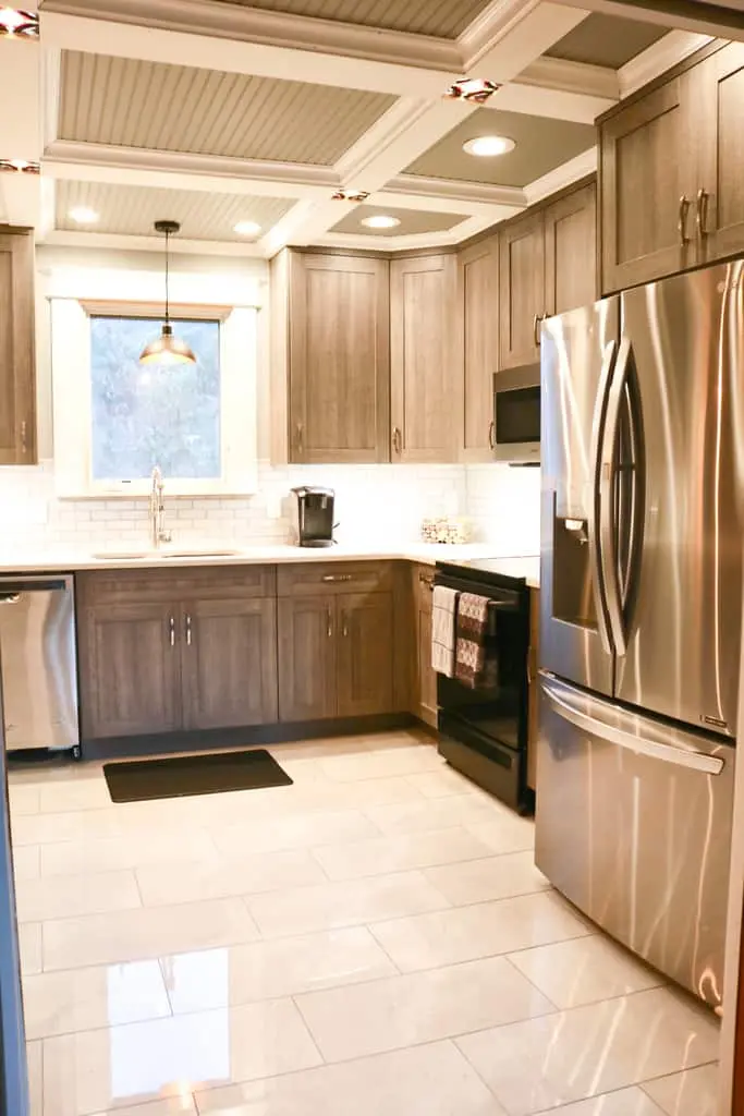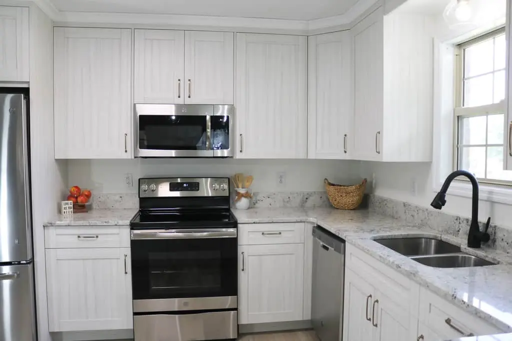 Shaker cabinets are made from a five-piece door, which comprises a four-piece frame with a flat panel in the center. These cabinets are traditionally made from high-quality American wood, but it's now fairly common to see them manufactured from MDF as five-piece or one-piece doors and painted in pretty much any color under the sun. For a more modern look, some homeowners will paint the upper cabinets one color, and then use a different paint or wood stain for the lower cabinets.