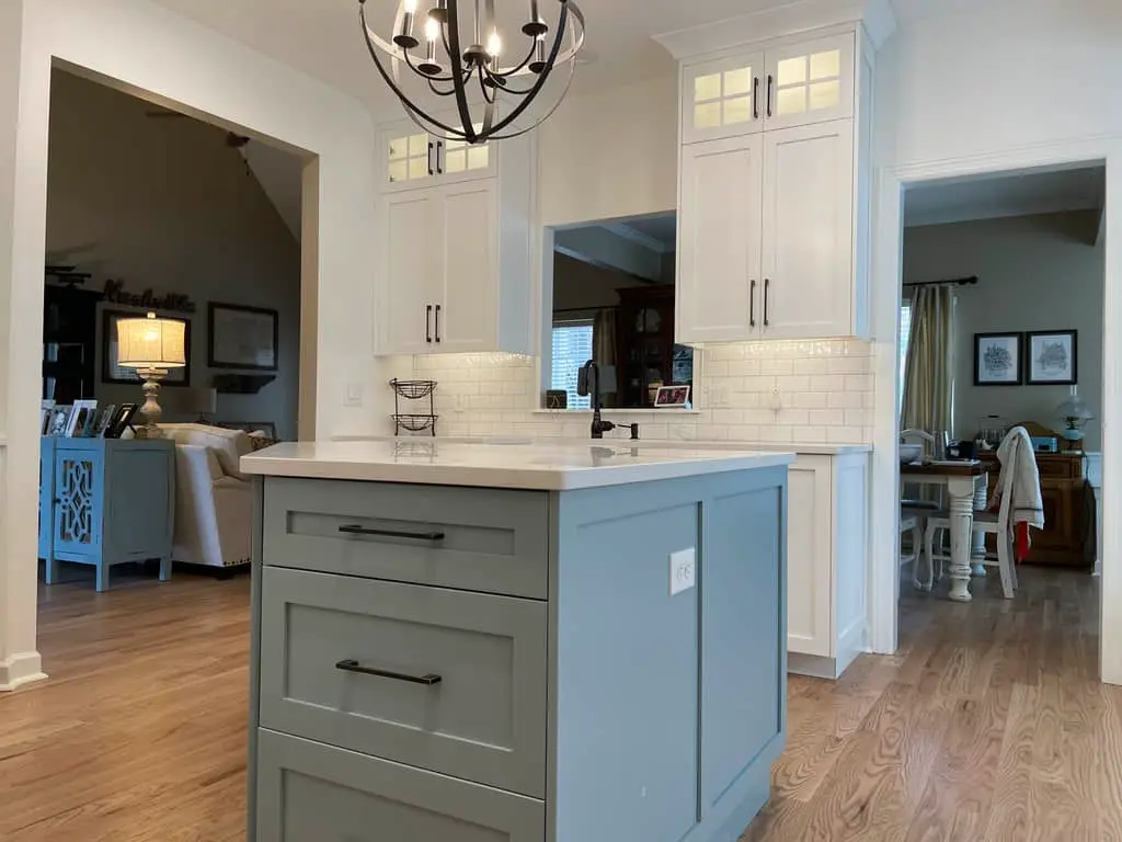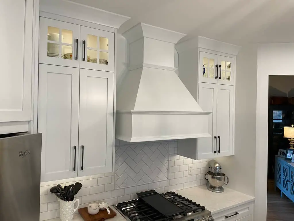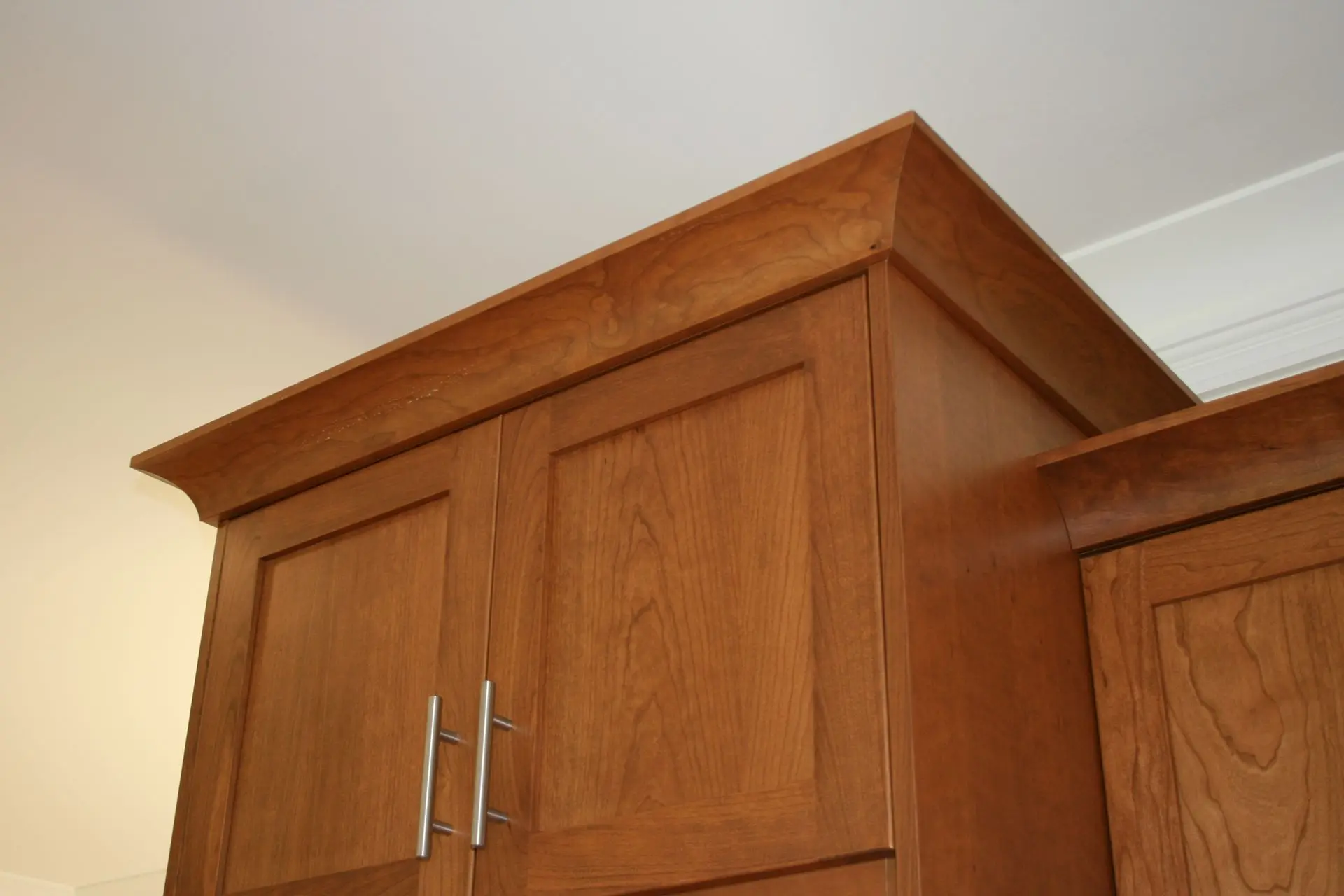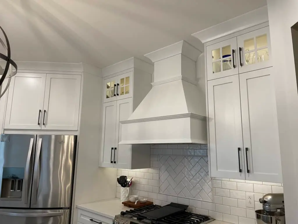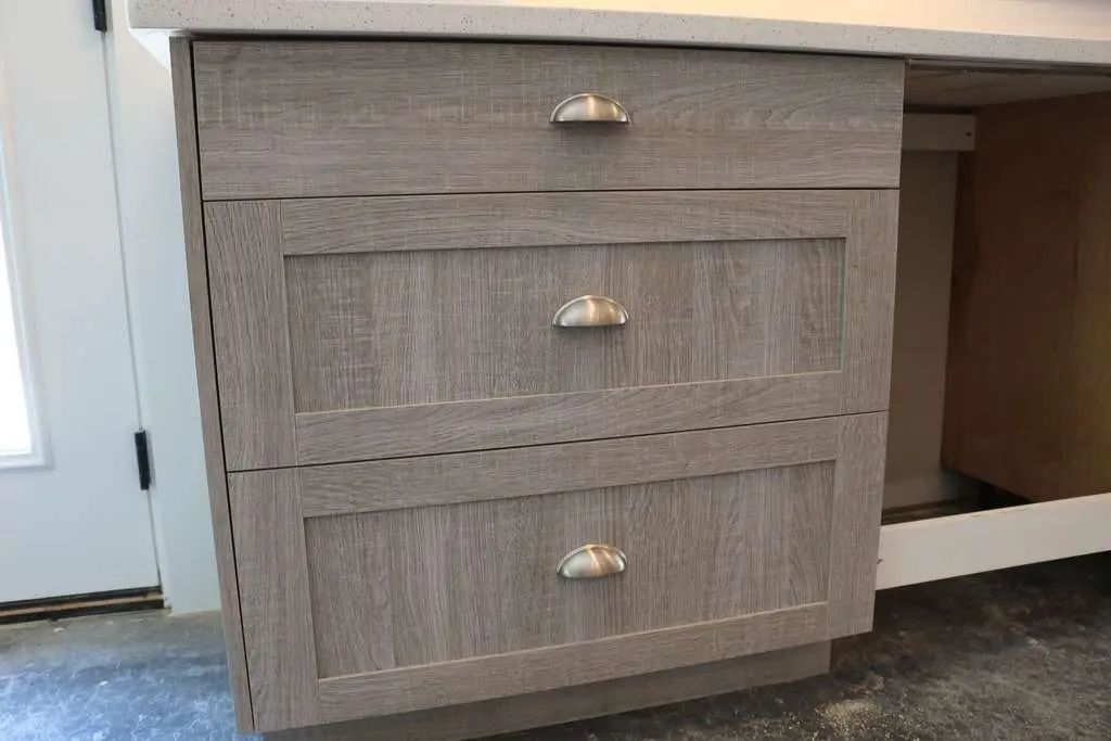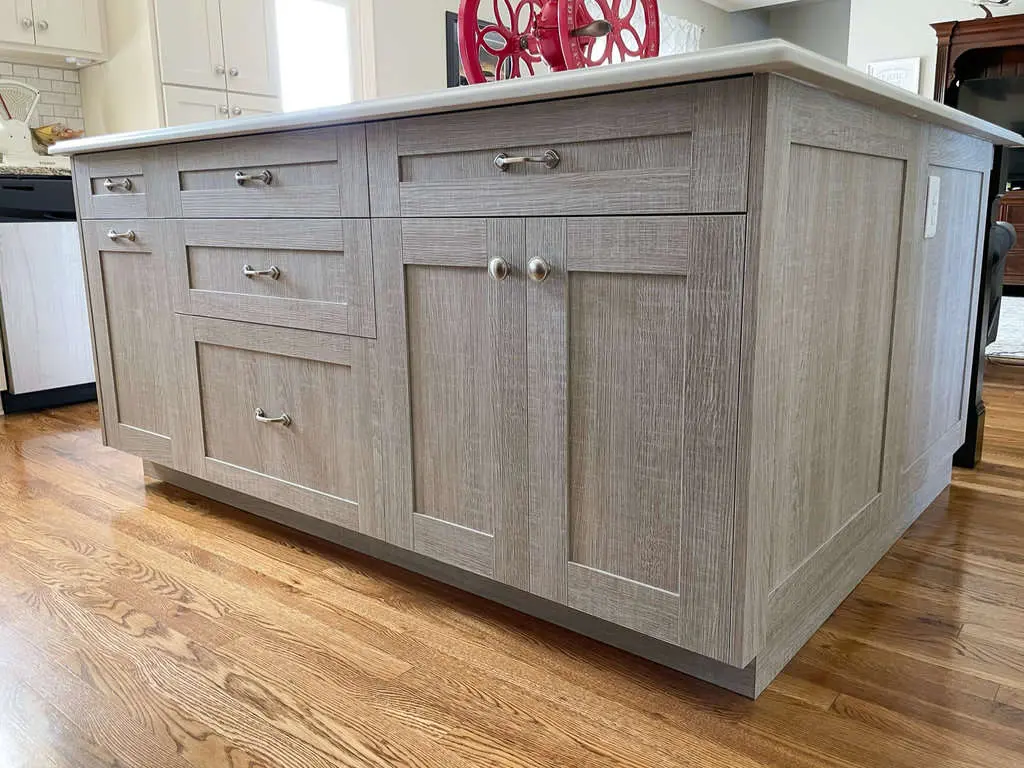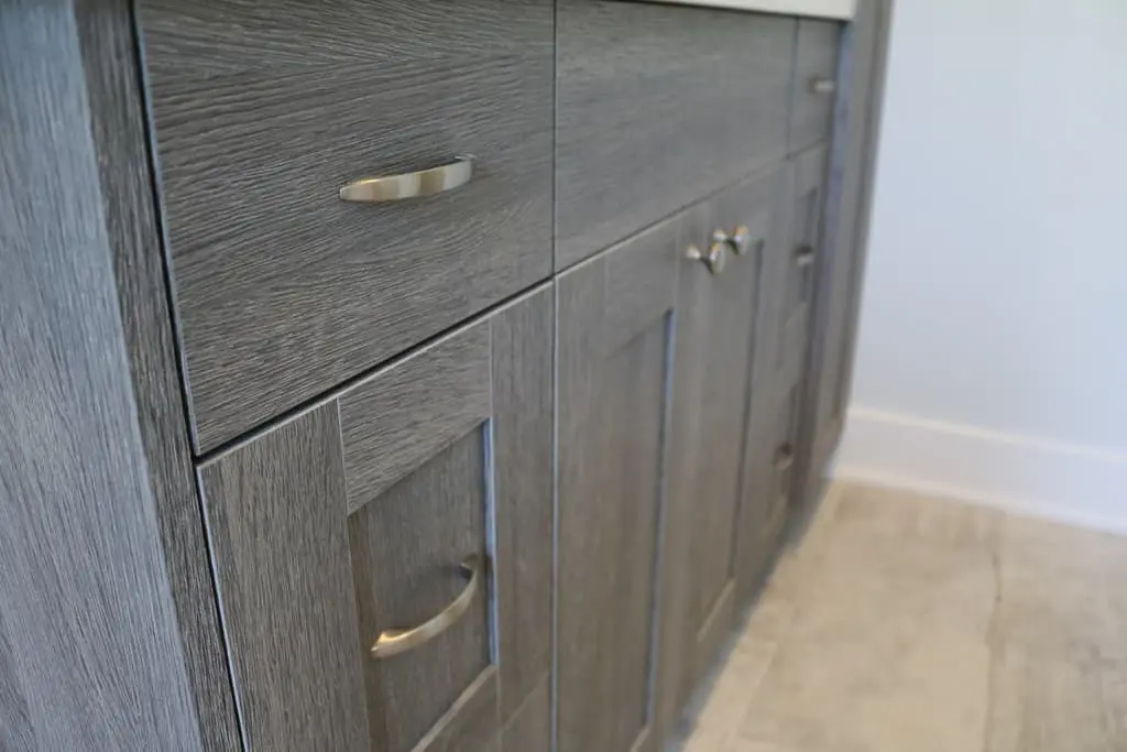 Shaker cabinets are made from a five-piece door, which comprises a four-piece frame with a flat panel in the center. These cabinets are traditionally made from high-quality American wood, but it's now fairly common to see them manufactured from MDF as five-piece or one-piece doors and painted in pretty much any color under the sun. For a more modern look, some homeowners will paint the upper cabinets one color, and then use a different paint or wood stain for the lower cabinets.