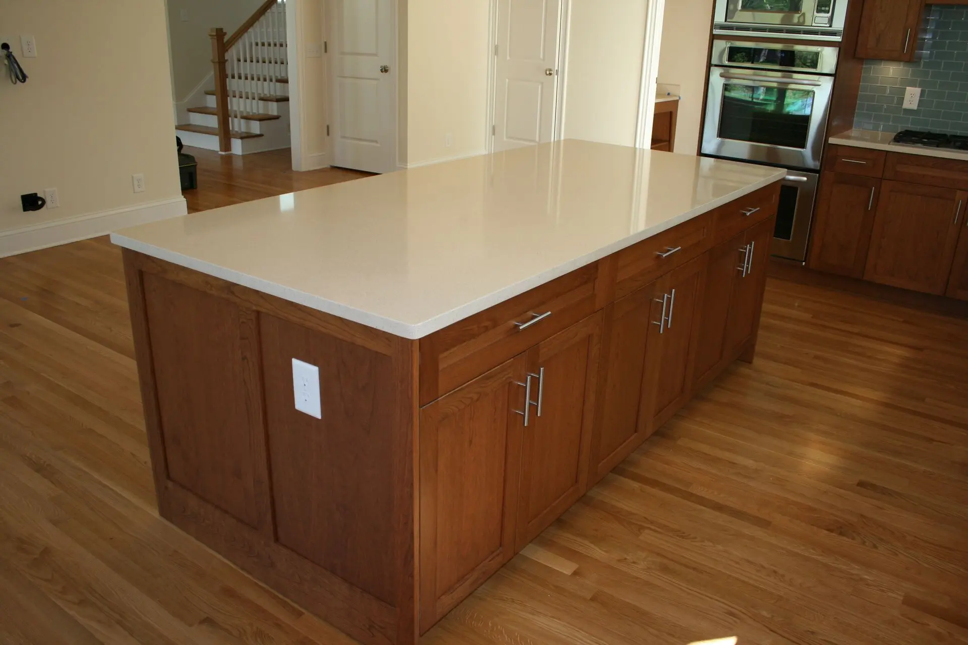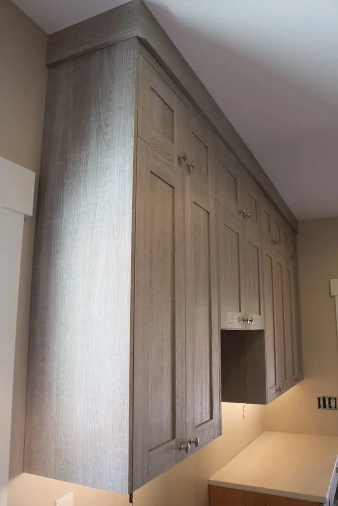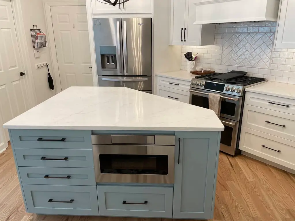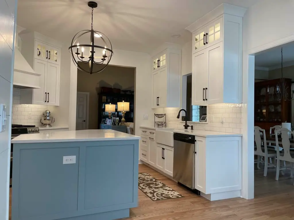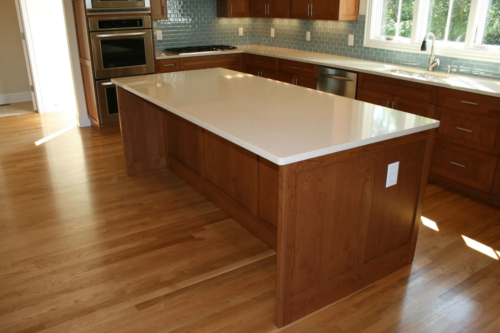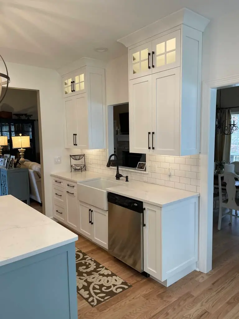 Shaker cabinets are made from a five-piece door, which comprises a four-piece frame with a flat panel in the center. These cabinets are traditionally made from high-quality American wood, but it's now fairly common to see them manufactured from MDF as five-piece or one-piece doors and painted in pretty much any color under the sun. For a more modern look, some homeowners will paint the upper cabinets one color, and then use a different paint or wood stain for the lower cabinets.