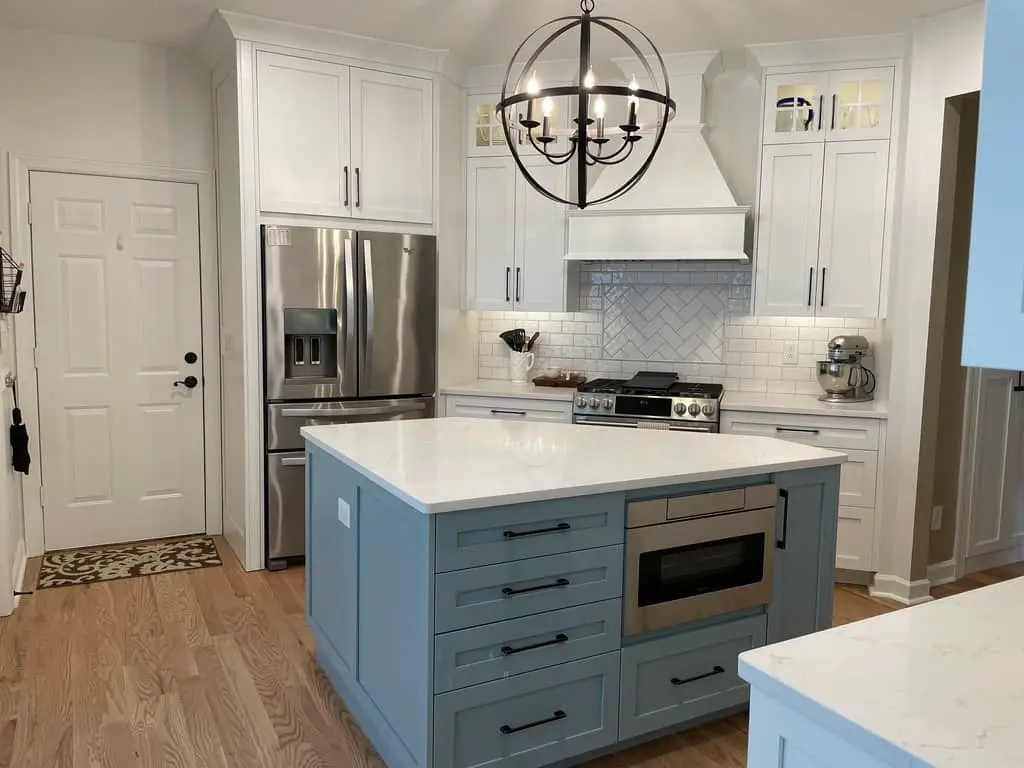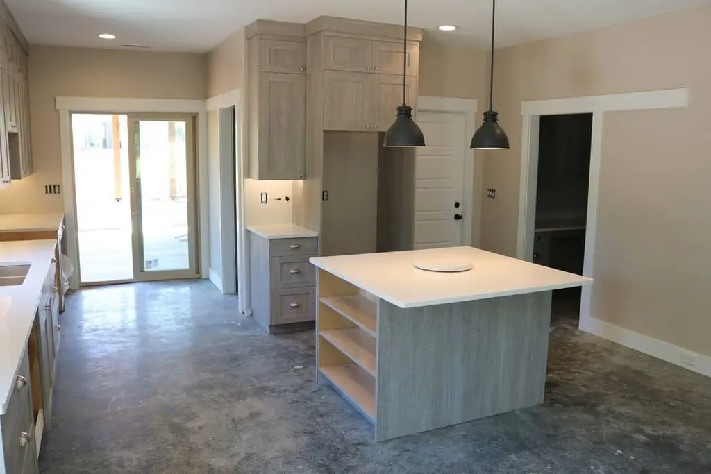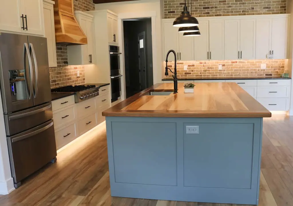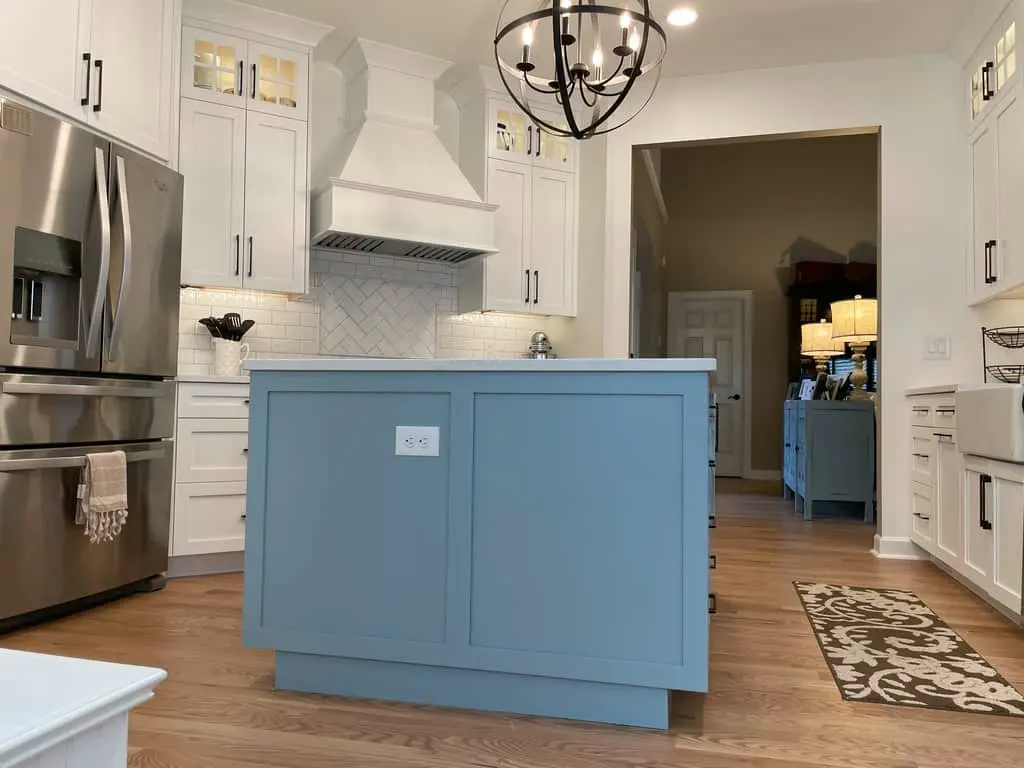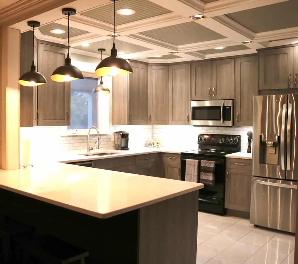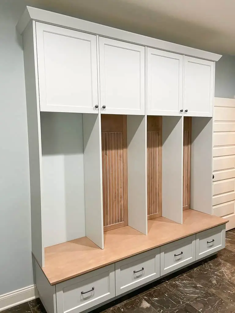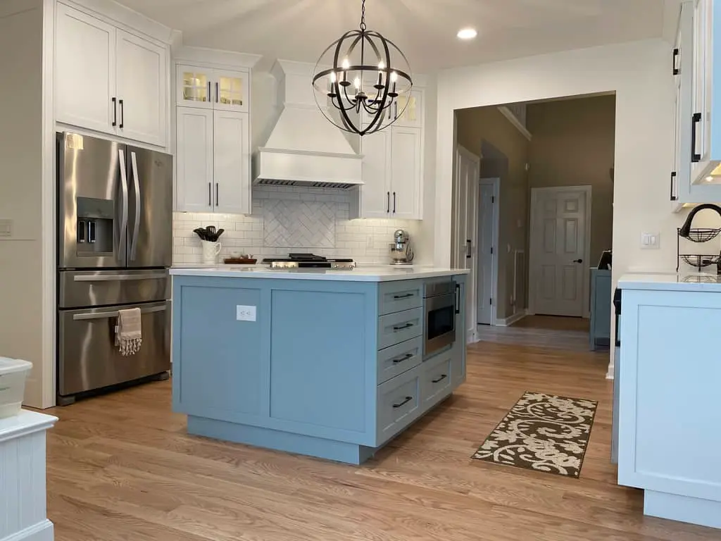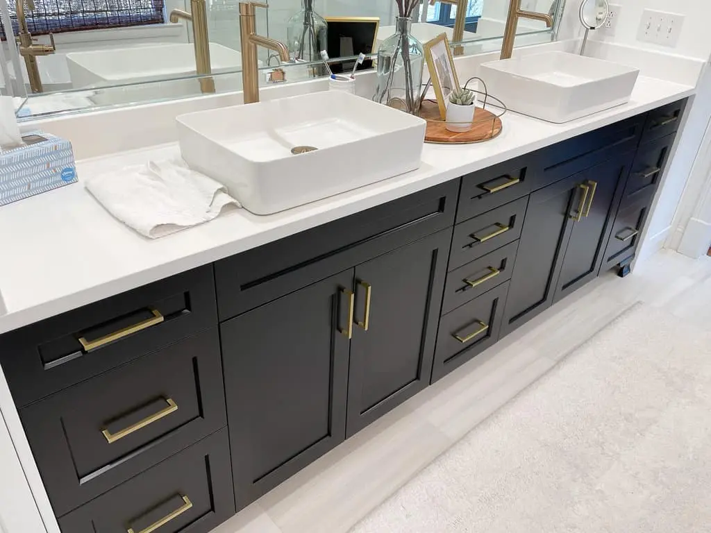 Shaker cabinets are made from a five-piece door, which comprises a four-piece frame with a flat panel in the center. These cabinets are traditionally made from high-quality American wood, but it's now fairly common to see them manufactured from MDF as five-piece or one-piece doors and painted in pretty much any color under the sun. For a more modern look, some homeowners will paint the upper cabinets one color, and then use a different paint or wood stain for the lower cabinets.