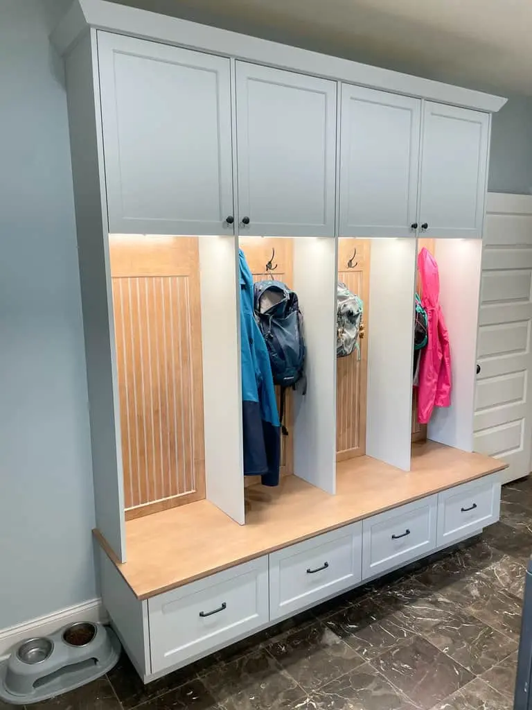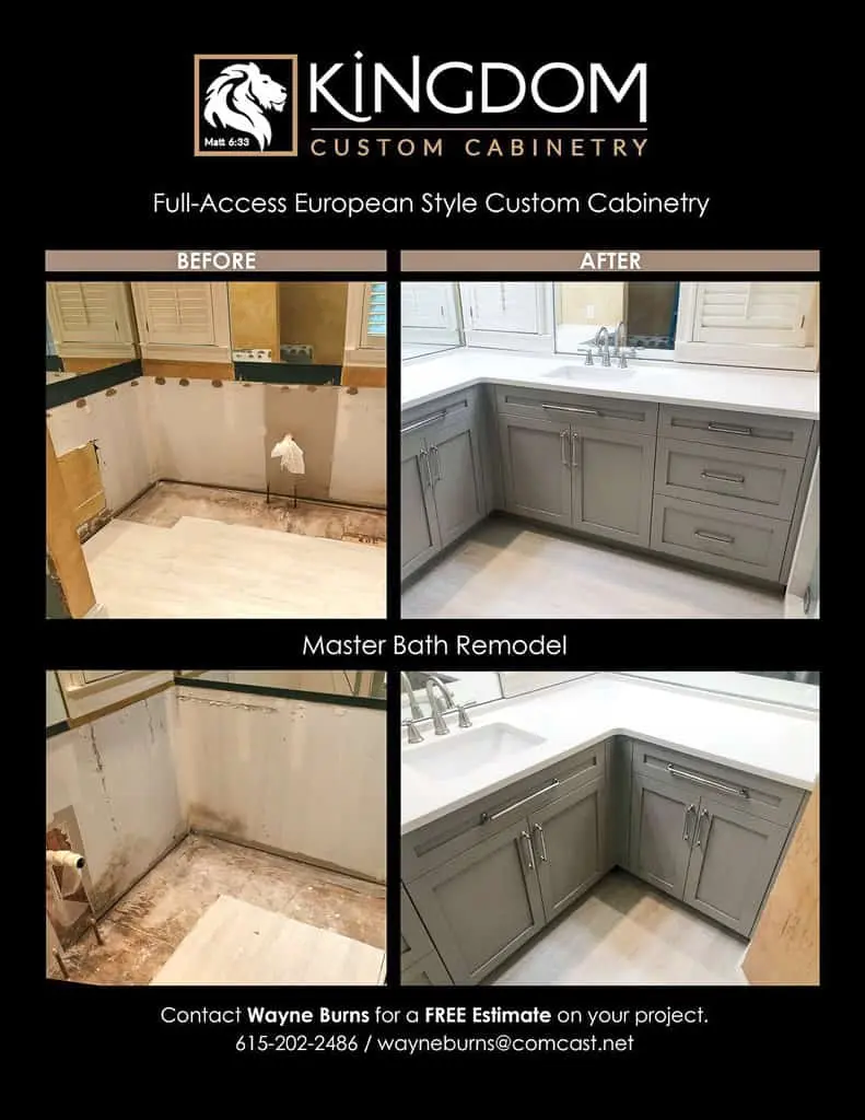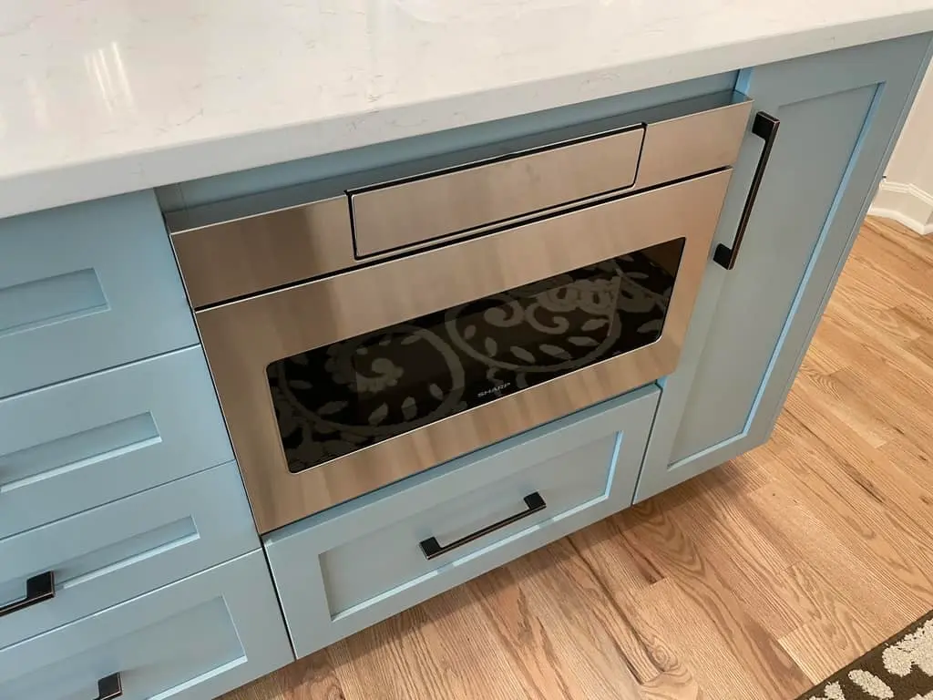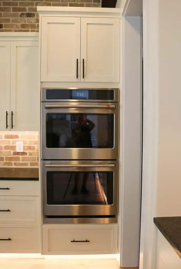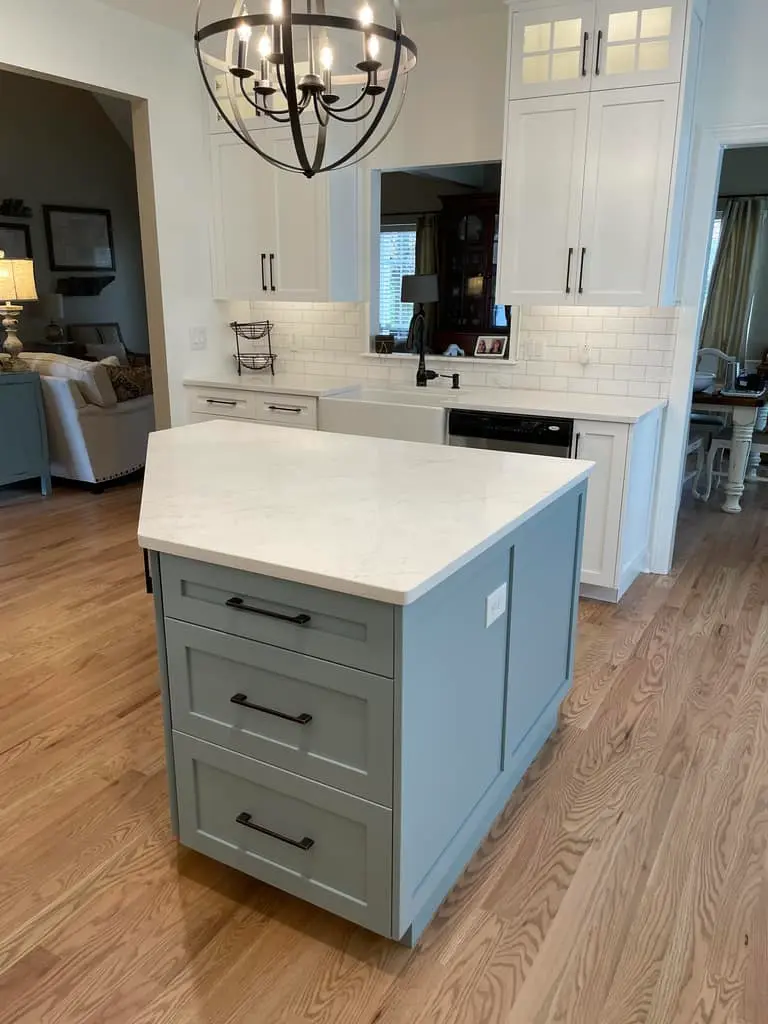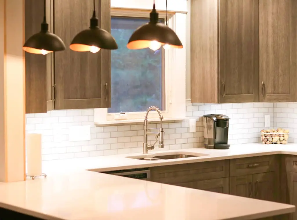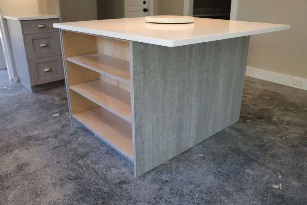 Shaker cabinets are made from a five-piece door, which comprises a four-piece frame with a flat panel in the center. These cabinets are traditionally made from high-quality American wood, but it's now fairly common to see them manufactured from MDF as five-piece or one-piece doors and painted in pretty much any color under the sun. For a more modern look, some homeowners will paint the upper cabinets one color, and then use a different paint or wood stain for the lower cabinets.