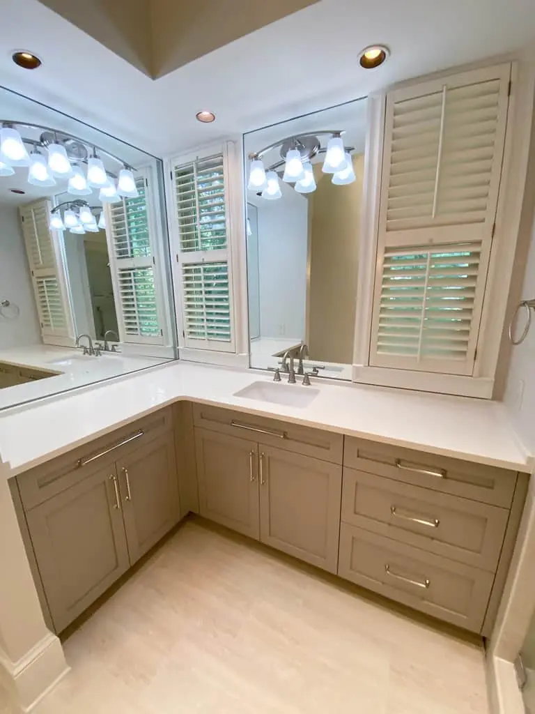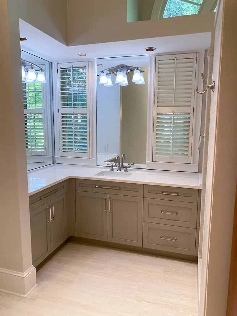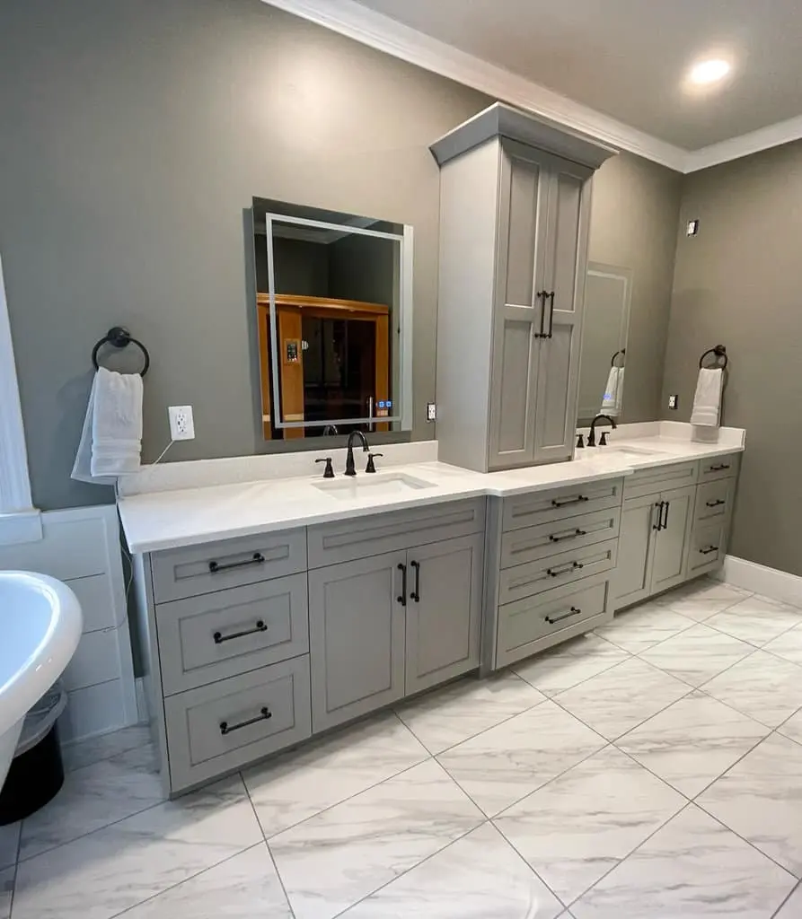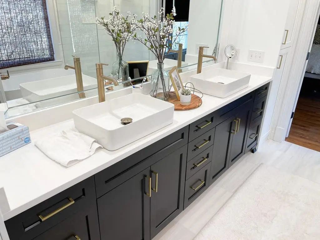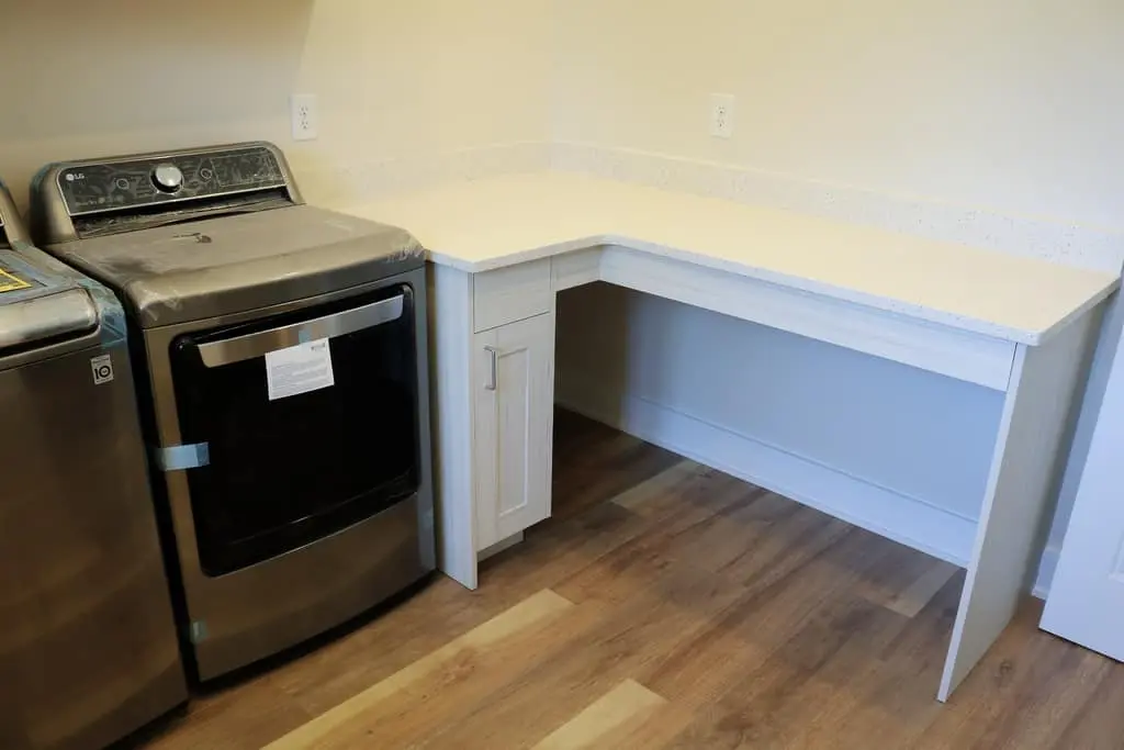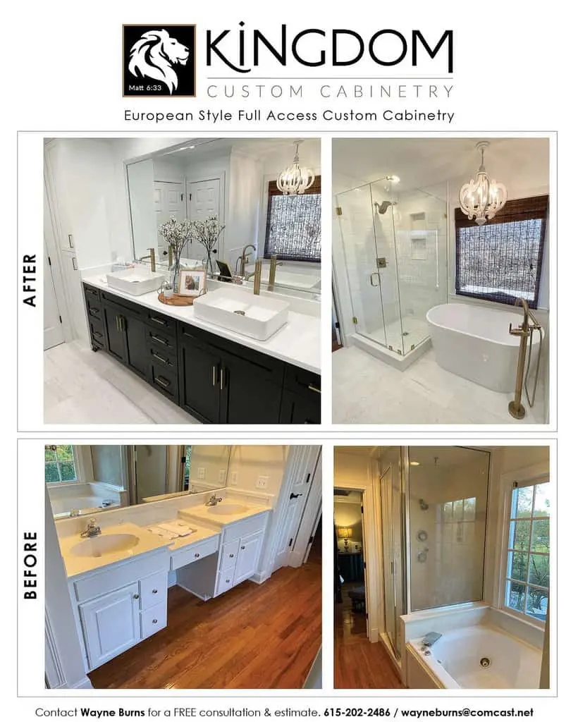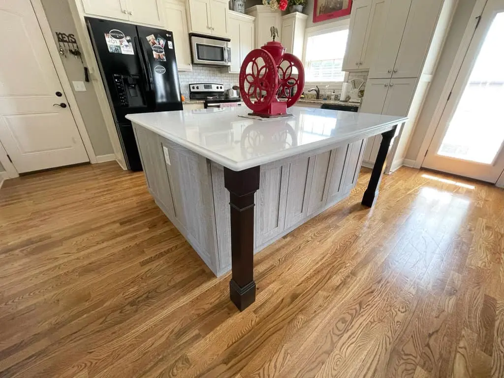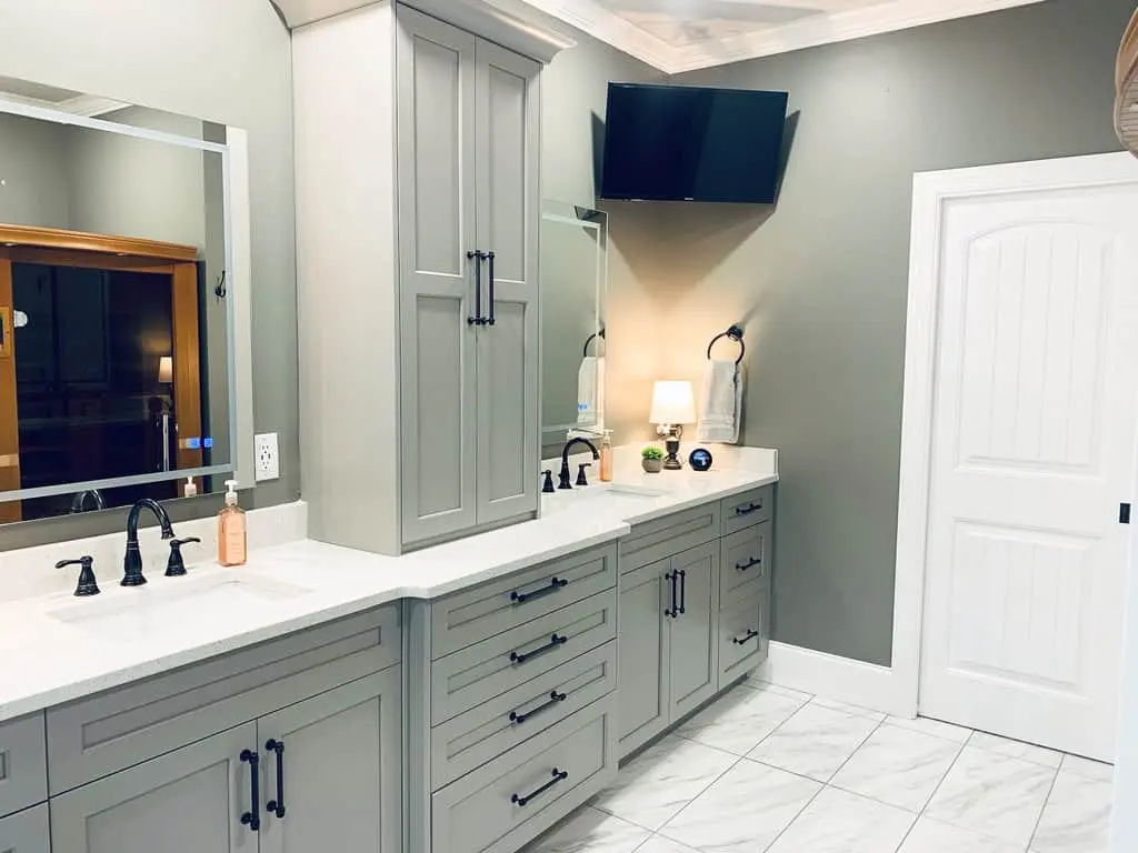 Shaker cabinets are made from a five-piece door, which comprises a four-piece frame with a flat panel in the center. These cabinets are traditionally made from high-quality American wood, but it's now fairly common to see them manufactured from MDF as five-piece or one-piece doors and painted in pretty much any color under the sun. For a more modern look, some homeowners will paint the upper cabinets one color, and then use a different paint or wood stain for the lower cabinets.